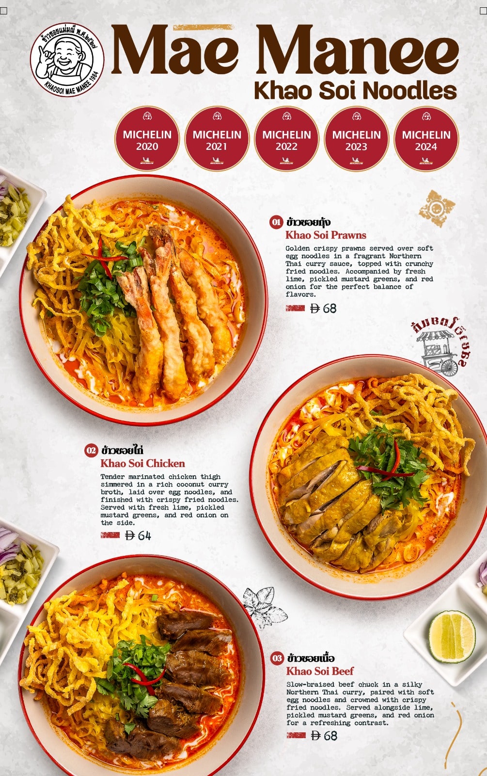 And now, we proudly serve the 5-time Michelin-awarded Khao Soi Mae Manee — flown in from Thailand and available exclusively at Noodle District for a limited time only.